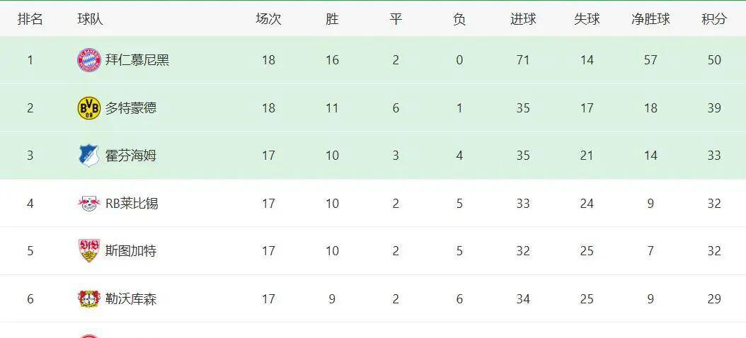 截至第18轮,德甲已迈入下半程,冠军归属几乎无悬念,接下来更受关注的是欧冠资格的争夺。传统劲旅多特蒙德状态稳步回升,稳坐第二宝座,优势显著。霍芬海姆则是本赛季的一大惊喜,坐拥第三名的位置,有望多年首次冲击欧冠席位。当然,第四名及“五虎将”和其他强队之间的竞争仍旧异常激烈,莱比锡红牛、斯图加特、勒沃库森以及法兰克福都紧咬积分榜,随时可能改变排名。